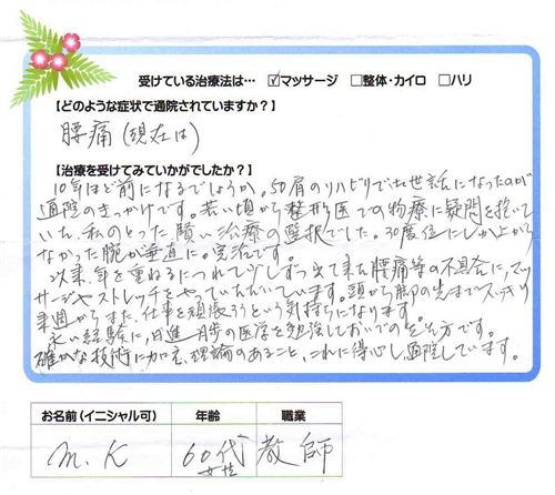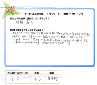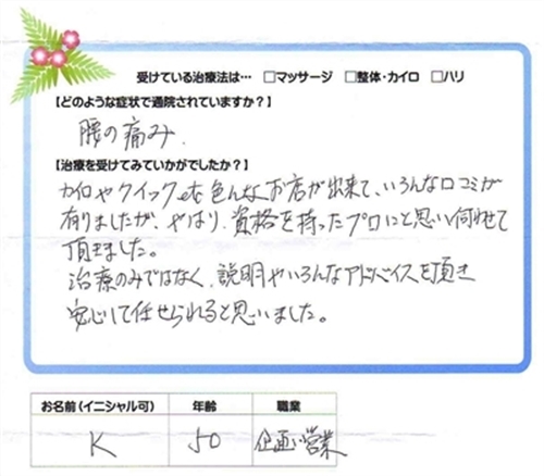 - 整骨院の専門外の疾患も詳しく説明してくれて専門医を紹介してくれた。