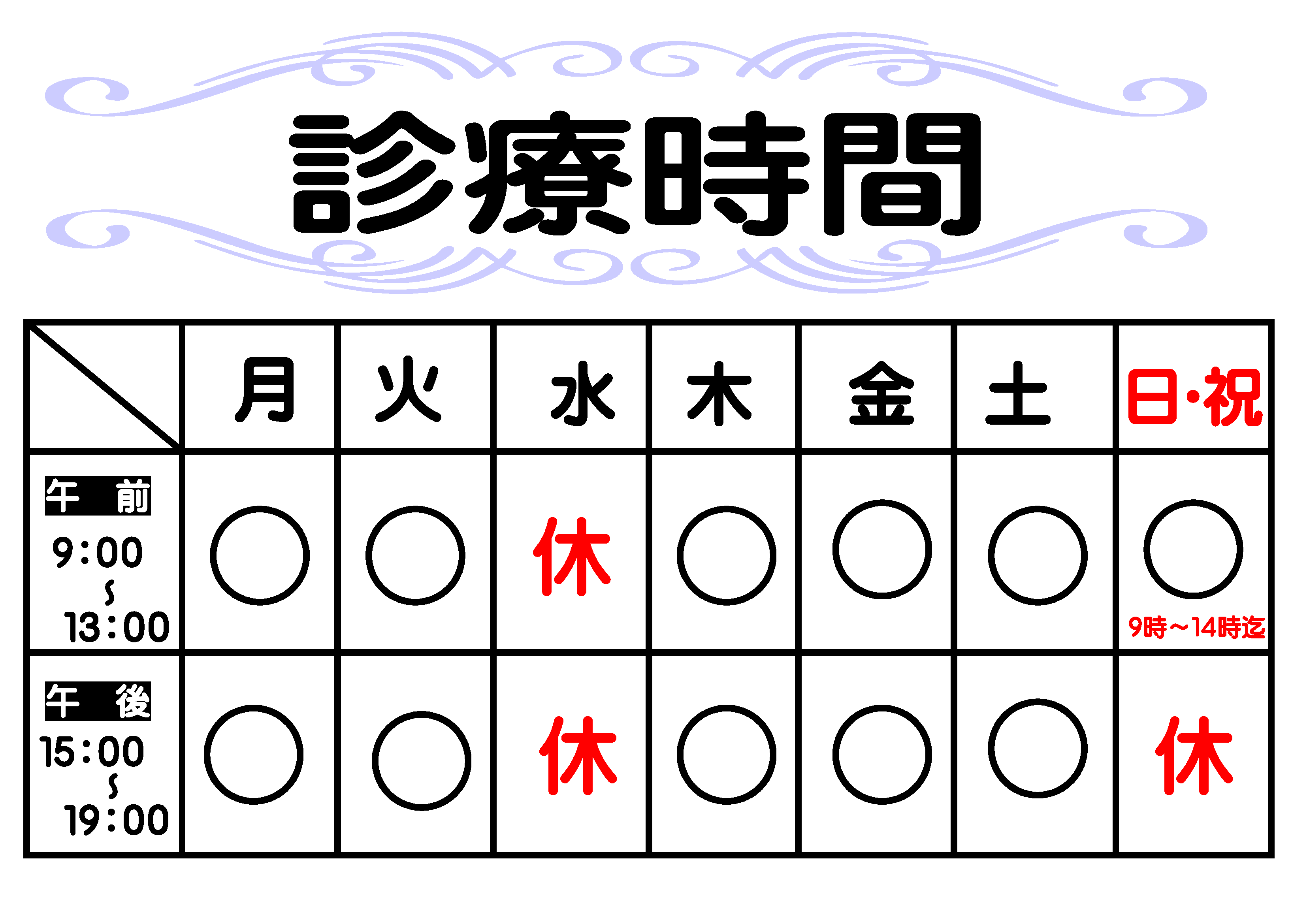 9:00-19:00 (水曜日を除く月〜土)、日・祝は9:00-14:00